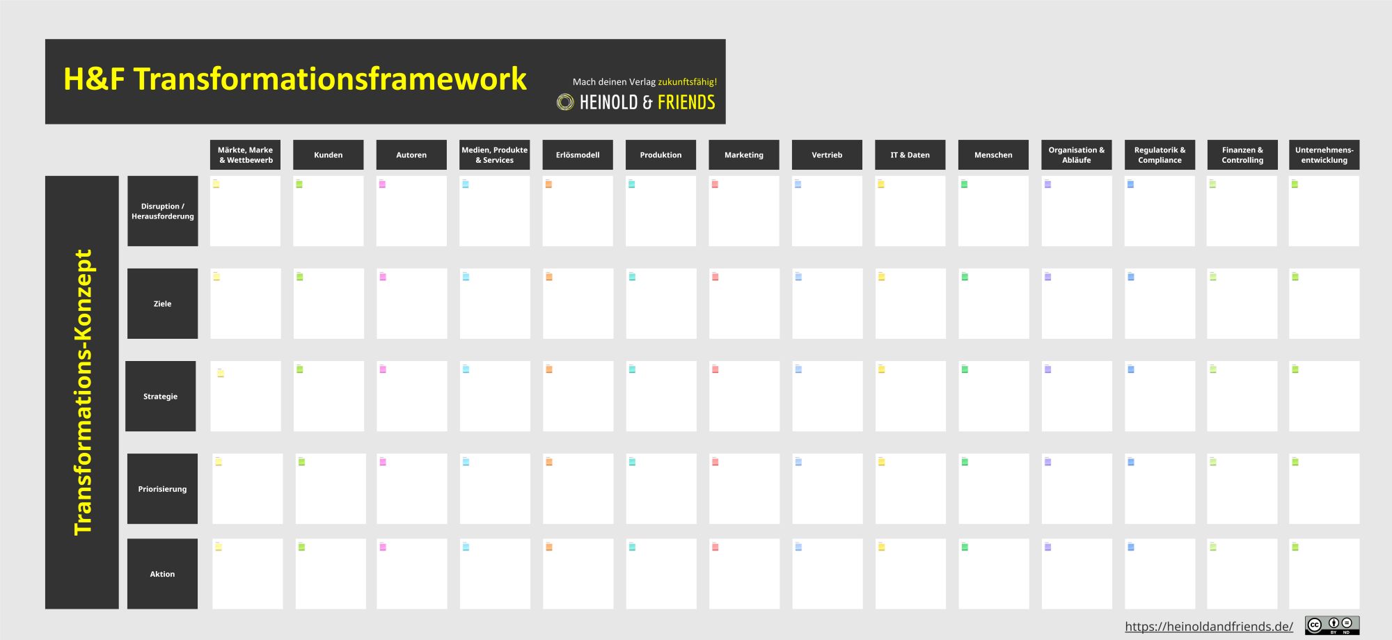 Wir von Heinold & Friends machen in unseren Projekten immer wieder die Erfahrung: Diese Herausforderungen sind lösbar. Und um in einem Verlag einen Überblick zu bekommen, welche Herausforderungen am drängendsten sind, haben wir ein einfaches, aber effektives Tool entwickelt: Das Heinold & Friends Transformationsframework für Verlage!